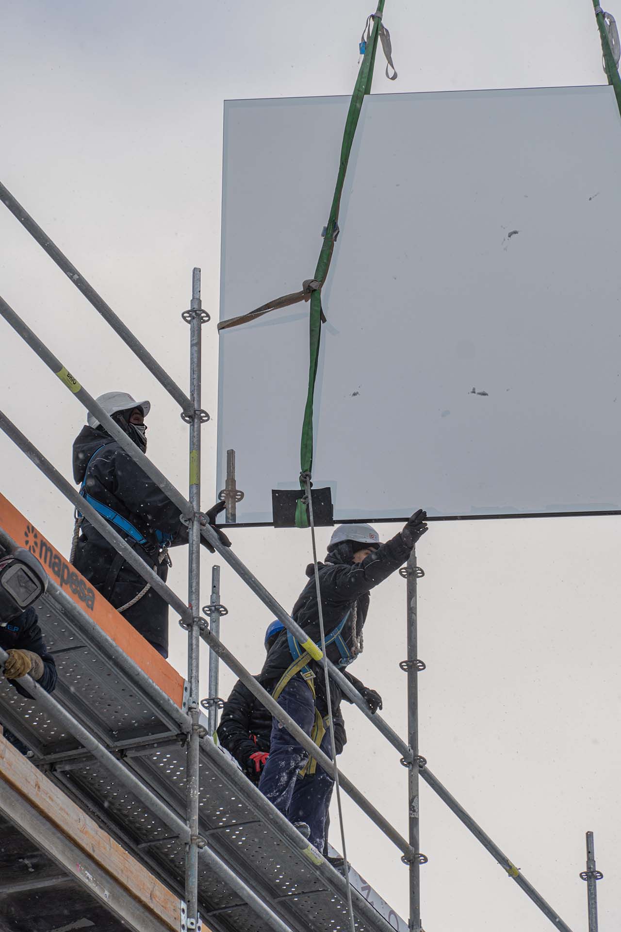 • Col·locació de grans panells de vidre manipulats mitjançant grues i sistemes d’elevació especialitzats.