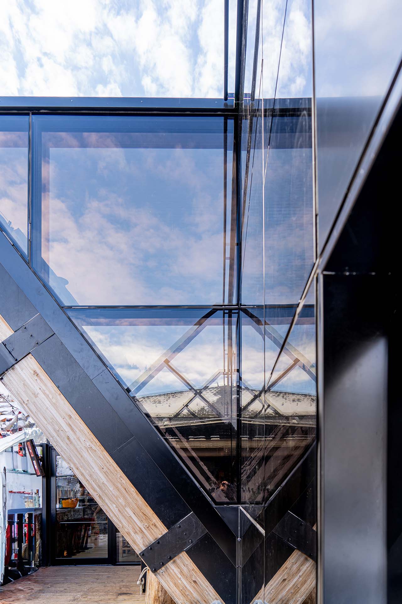 El nou mur cortina, format per grans panells de vidre reflectant, crea un efecte mirall que integra l’edifici dins del paisatge de manera harmoniosa. Aquesta solució arquitectònica permet: